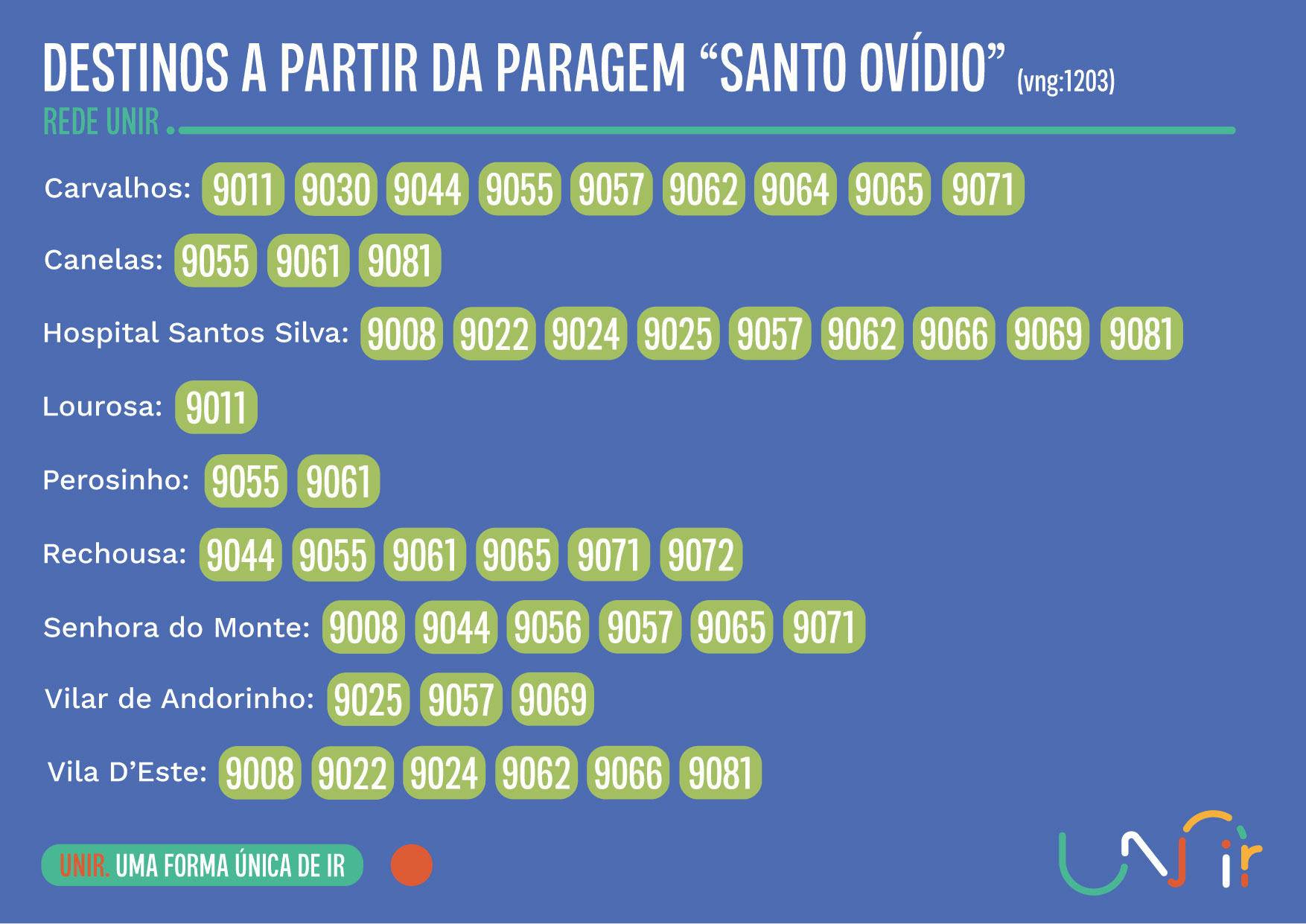 Foi também feito um pequeno resumo dos destinos onde era possível chegar a partir da paragem de Santo Ovídio, apresentando assim todas as alternativas possíveis para chegar a Canelas, aos Carvalhos, ao Hospital Santos Silva, a Vila d'Este, e outros pontos de interesse relevantes.