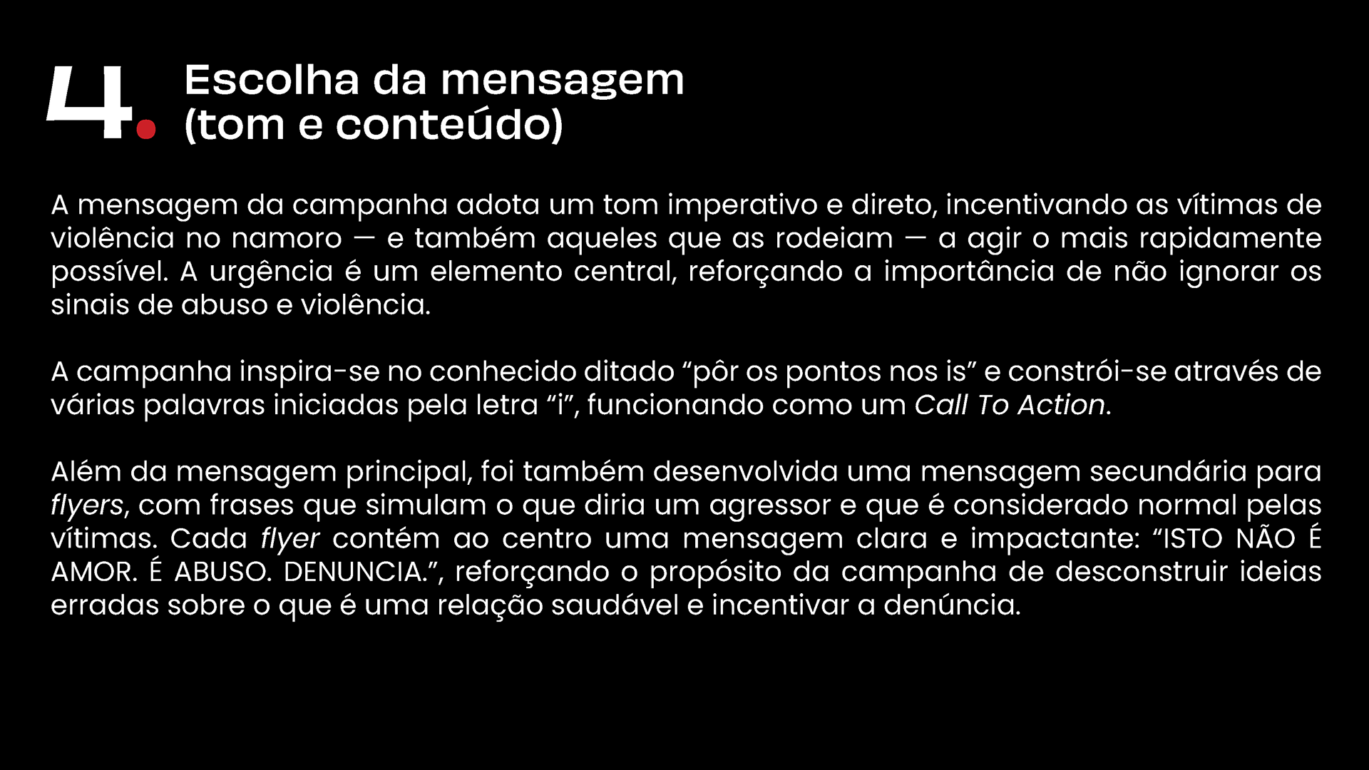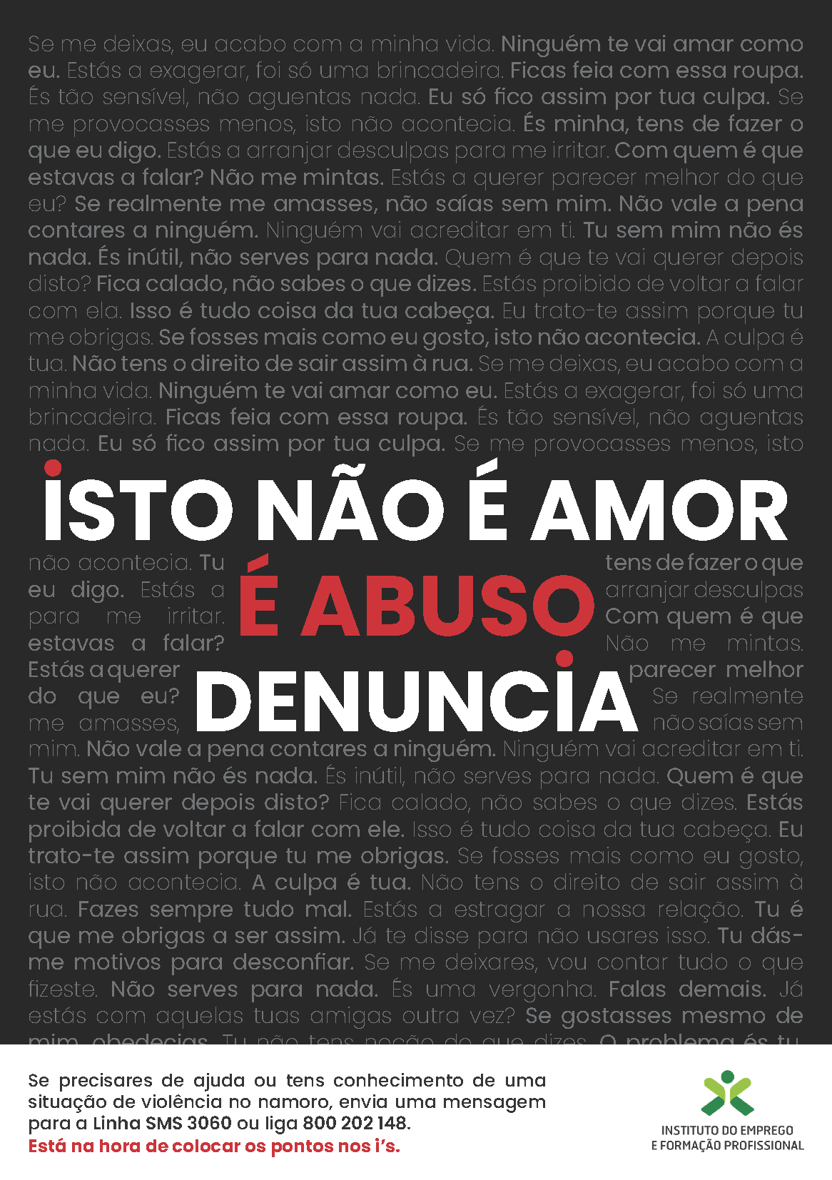 Já os flyers seguem o mesmo mote, contudo, e aproveitando o formato mais pequeno e portátil, optámos por uma abordagem mais direta e impactante. O fundo é preenchido com frases típicas de um agressor, muitas vezes vistas pelas vítimas como normais. Em destaque, a mensagem é clara e sem margem para dúvidas: «ISTO NÃO É AMOR. É ABUSO. DENUNCIA.».