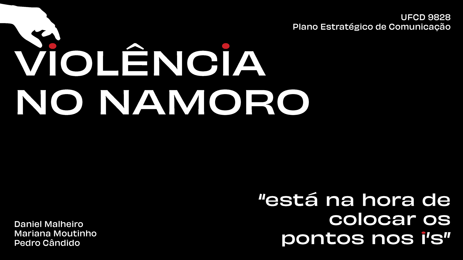 Na UFCD 9828, denominada "Plano estratégico de comunicação", foi-nos proposto o desenvolvimento de uma campanha de comunicação sobre o tema da violência doméstica. Cada grupo escolheu uma vertente específica, e o nosso decidiu focar-se na violência no namoro.